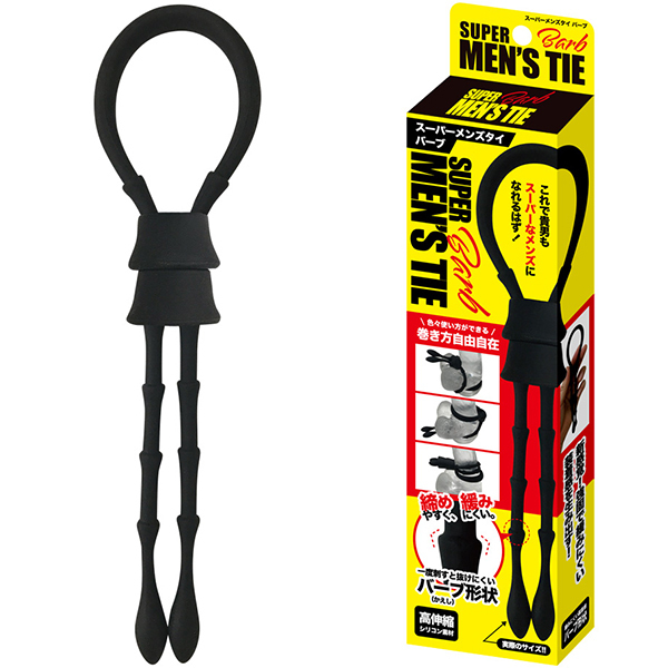締めやすく、緩みにくい。「バーブ(かえし)」の付いたスーパーメンズタイ!大きな特徴は、円錐のような八の字形状が連なる「バーブ造形」によるロック構造です。「バーブ」とは、配管継手のバーブホースや、釣り針のかえしといった、一度刺すと抜けにくくなる膨らみ造形のこと。その「バーブ」によるロック構造は、シンプルな造りゆえ強固で緩みにくい装着感を生み出します。サクサクと締めやすく、ガチリと緩みにくい、よくあるバネ式ストッパーでは味わえない快適さです。さらに、ストッパー2個付いていますので、二重巻きやダブル巻きなど色々使い方ができる多機能仕様。高伸縮でさわり心地の良いシリコン素材。これで貴男もスーパーなメンズになれるはず! |