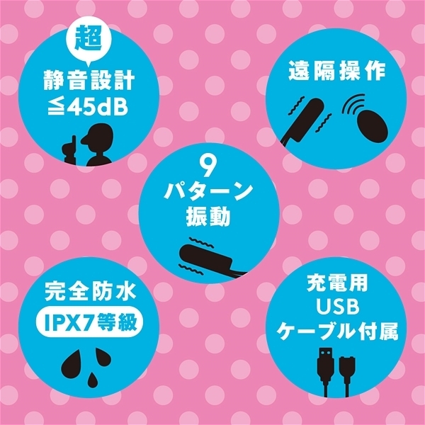こっそり遊べる!超静音≦45dB、プレイの幅がグンッ!と広がる完全防水&遠隔操作可能な静音ローター!思わず声が出てしまう程のパワフルな9パターンの振動に対し、静音性にもきちんと配慮した造りなので、お風呂場でも道端でも…いろんな場所でレッツプレイ!完全防水仕様なので使用後の丸洗いも可能で清潔に保てます。シリコン紐付きなので、取り出しもラクラクです。どこでもサカって絶対絶頂!●カラー:ピンク