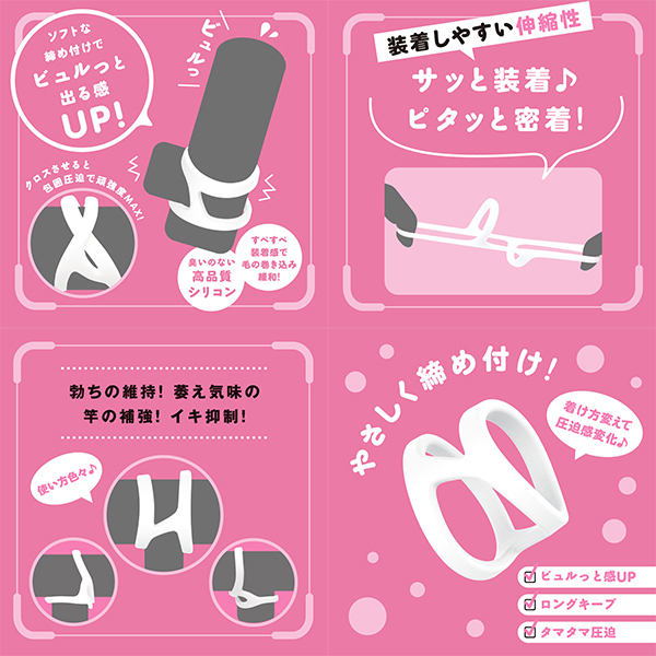 超!ぷにっとりんぐから根元と竿元に簡単装着が出来るツインロックソフトverが登場。サッと装着♪ピタッと密着!装着しやすい伸縮性、臭いのない高品質シリコンで根元と竿元をやさしく締め付け、着けてるストレスを軽減!すべすべ装着感で毛の巻き込みを緩和。挟み込んだり押しだしたりタマタマ圧迫の使い方も色々。着け方を変えて圧迫感も変化♪自分好みの締め付けで、勃ちの維持!萎え気味の竿の補強!イキ抑制!クロスさせると包囲圧迫で頑強度MAXに!ソフトな締めつけでビュルっと出る感UP♪ゆ〜っくり夢心地発射!