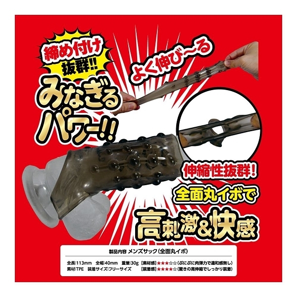 夜もがんばリング、で大人気のやわらかメンズリング「ち●こリング」シリーズに、スーパーなサックが新登場!今度のち●こサックは「ベースに装着するメンズサック」!ぷにぷにっとした柔らかなTPE(エラストマー)素材は、ぐい〜んとよく伸びる高伸縮性!サイズ問わずでどんな大きさでもしっかりフィットの抜群の装着感&締付感!さらに、ツンツンとしたトゲトゲ突起による高刺激快感が!男らしさを引き立たせるスモークカラー!「No.1」は、刺激高めにぐるっと配置された全面丸イボ突起!規則的に並んだ大小丸イボがアナタをスーパーに変身させるはず!ほとばしるストロング、みなぎるパワー! |
