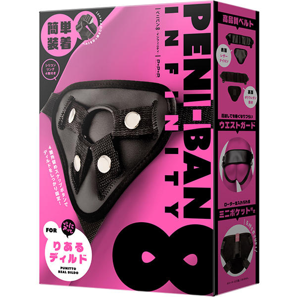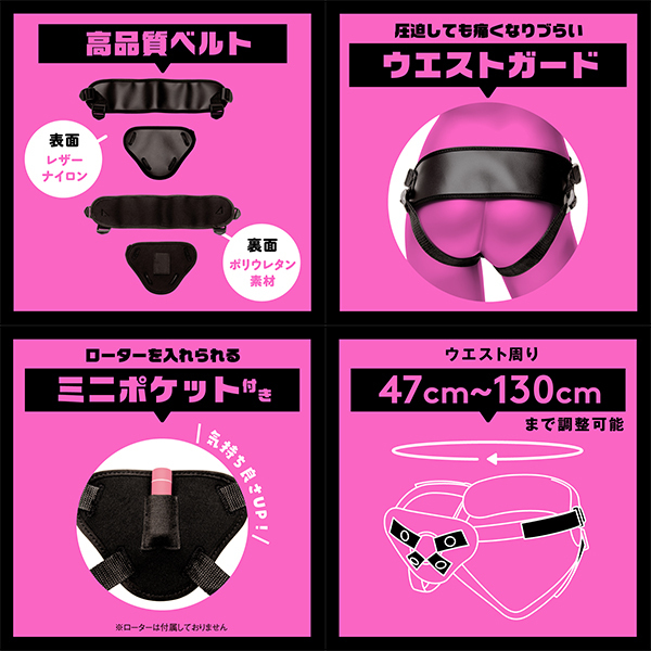 イキかた、責めかた、∞(無限大)!!男性凸女性凸男性凹女性凹色んな組み合わせが楽しめるペニバンです!ディルドはスナップボタンで4箇所留めしてしっかり固定!ベルトを引っ張るだけでフィットする簡単装着!シリコンリングが4種類も付いているのでディルドのサイズに合わせて装着が可能!ポリウレタン素材、レザーナイロンを使用した高品質なベルトを採用し、圧迫しても痛くなりづらいウエストガード付き。ペニバンの裏にはミニポケットが付いていてローターの装着が可能、気持ち良さがUP!勃たない時のフォローに!椅子や抱き枕に装着して推しとの妄想H、見せつけプレイに大活躍!(まわし仕様じゃないので装着可能です)胸元に装着して直視させる変態プレイも♪ウエスト周り43cm〜130cmまで調整が可能です。※ディルドの吸盤はレザーナイロンにフィットしづらい仕様となります。ディルドを更にしっかり固定したい場合は、補助版を挟んでご使用ください。※ディルド・ローターは付属しておりません。ぷにっとりあるディルドの使用をオススメいたします!※本商品が汚れた場合は、濡れたタオルで拭いてお手入れをしてください。 |