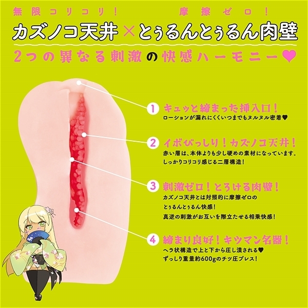 無限コリコリのカズノコ天井!摩擦ゼロのとぅるんとぅるん肉壁!2つの異なる刺激の快感ハーモニー!締まり良好なキツマン名器がヘラ状構造で上と下からチツ圧プレス!むぎゅーっと人肌感触のずっしり肉厚重量約600g!手になじむなめらか曲線ボディに、興奮度MAXのぷっくりワレメ!匠の造形技術による超リアルトルソー型ホール!耐久性抜群の高弾力もっちり快感!直接肌に触れるものだから、安全性と感触にこだわった高品質なエラストマーを使用しています。パッケージイラスト:maruku