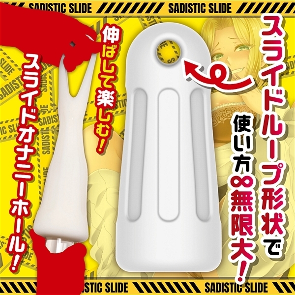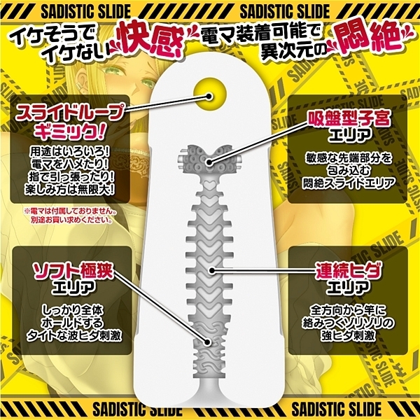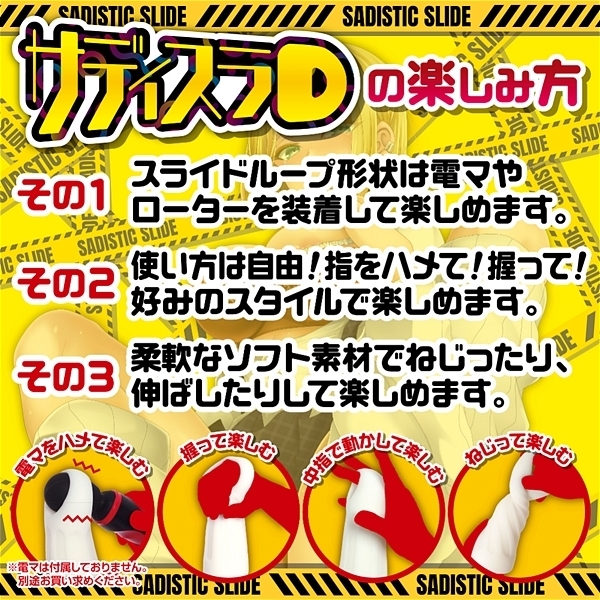 先端を刺激するギミックホール「サディスラD」は伸ばして楽しむスライドオナニーが楽しめるオナホールです。電マやローターを装着できるオナホールが欲しい!オナホールを伸ばして刺激したい。という新しい想像から「サディスラD」は開発されました。上部に空いている「スライドループギミック」は電マやローターをハメたり、引っ張ったり、握ったり、ねじったりと、いろいろな楽しみ方で遊べます。「電マ」「大型ローター」を装着することにより、他では味わえない「先端を直撃する強力な振動」で「イケそうでイケない状態」【悶絶】を味わえます。根本をおさえて伸ばして楽しむ「スライドオナニー」やねじって楽しむ「スクリューオナニー」などオナホール本体の「形状変化」に取り組んだ「新しいスライドオナニー」をお楽しみください。非貫通オナホール、ソフト素材使用。保管に便利なブリスターケース付き、専用ローション付き。※電マ、ローター等は付属しておりません、別途お買い求めください。 |