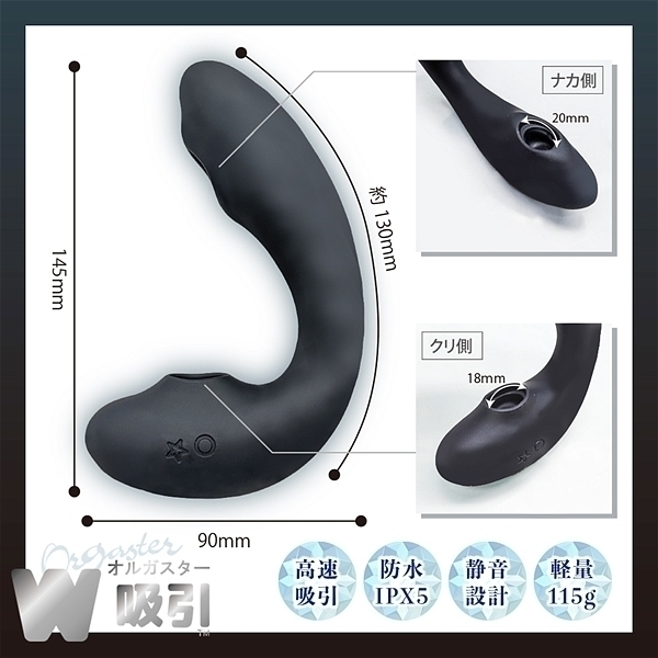 Wで吸う。新構造吸引システム−エアバルブ方式−でク●イキ・ナカイキ連続ゼッチョウの嵐を巻き起こす。USB充電式。軽量・静音設計、シリコン製の柔軟に曲がるフレキシブルネック。防水(IPX5)仕様でお手入れ簡単。●カラー:ブラック
