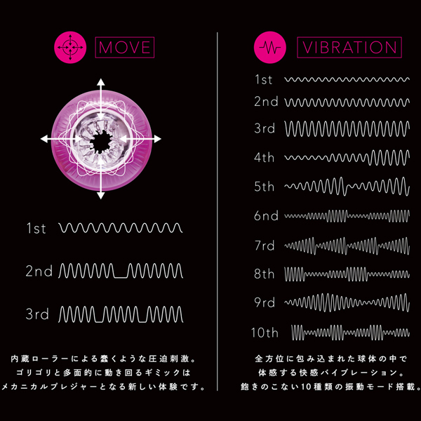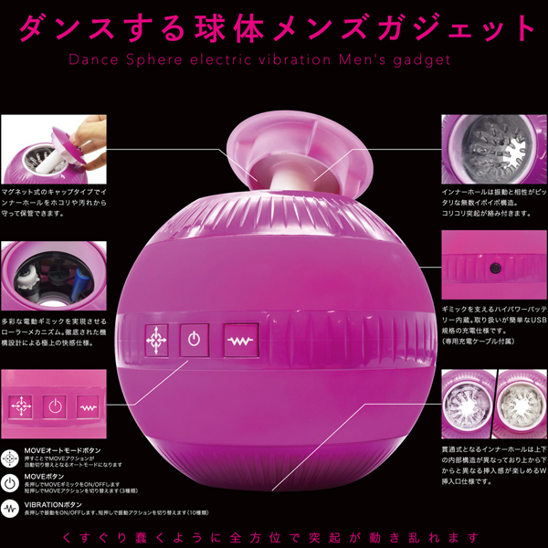 蠢くように動き乱れる新感覚ギミック搭載!お洒落な球状デザインが特徴的な電動型オナホ(貫通式)。無数のイボと突起の絡みつく刺激に加えて、バッテリー駆動からなるハイパワーな3種のローラーギミック&10種の振動で快感倍増!各動作は独立始動タイプなので、振動だけ、ギミックだけといった使用も可能です。マグネット式蓋付きで衛生的に保管していただけます♪USB充電式